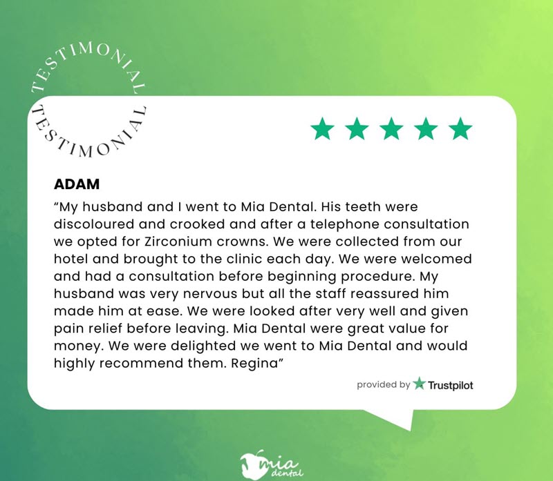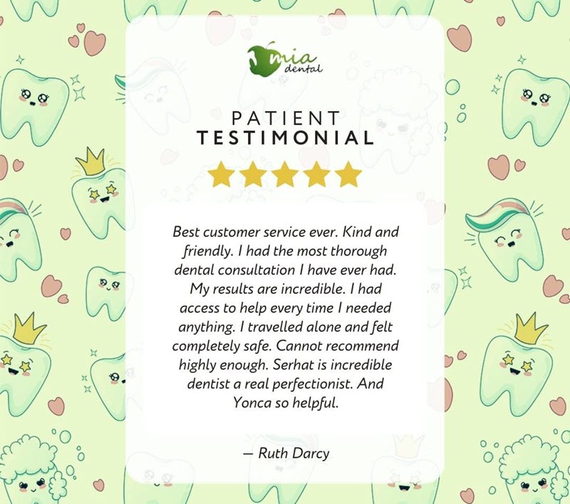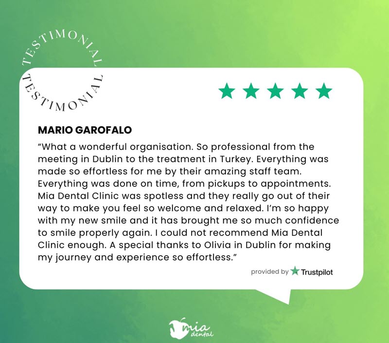 • "What a wonderful organisation. So professional from the meeting in Dublin to the treatment in Turkey. Everything was made so effortless for me by their amazing staff team. Everything was done on time, from pickups to appointments. Mia Dental Clinic was spotless and they really go out of their way to make you feel so welcome and relaxed. I'm so happy with my new smile and it has brought me so much confidence to smile properly again. I could not recommend Mia Dental Clinic enough. A special thanks to Olivia in Dublin for making my journey and experience so effortless."
