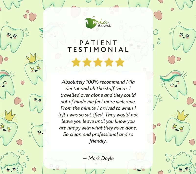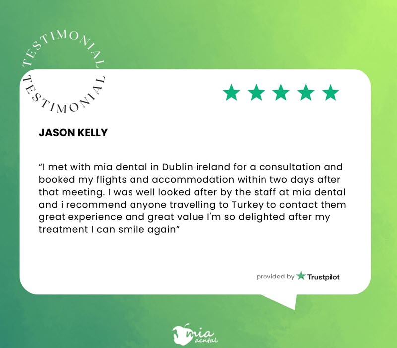 • "I met with mia dental in Dublin ireland for a consultation and booked my flights and accommodation within two days after that meeting. I was well looked after by the staff at mia dental and i recommend anyone travelling to Turkey to contact them great experience and great value I'm so delighted after my treatment I can smile again"