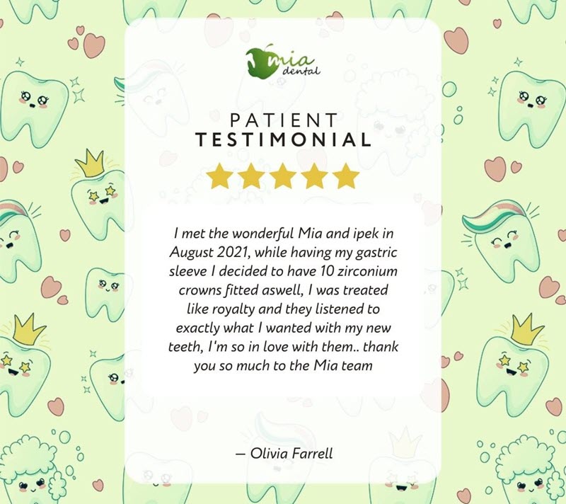 • "I had my zirconium crowns fitted in mia dental kusadassi, and I would highly recommend this 5 star cosmetic dental practice... My experience from start to finish was first class, from the beautiful surroundings to the smiling helpful team that went above and beyond to make my procedure a memorable one, they listened to everything that I wanted, and gave me a beautiful smile and also gave me my confidence back... thank you so much ipek, yonca and the amazing Mia for your personable yet professional manner xxx"